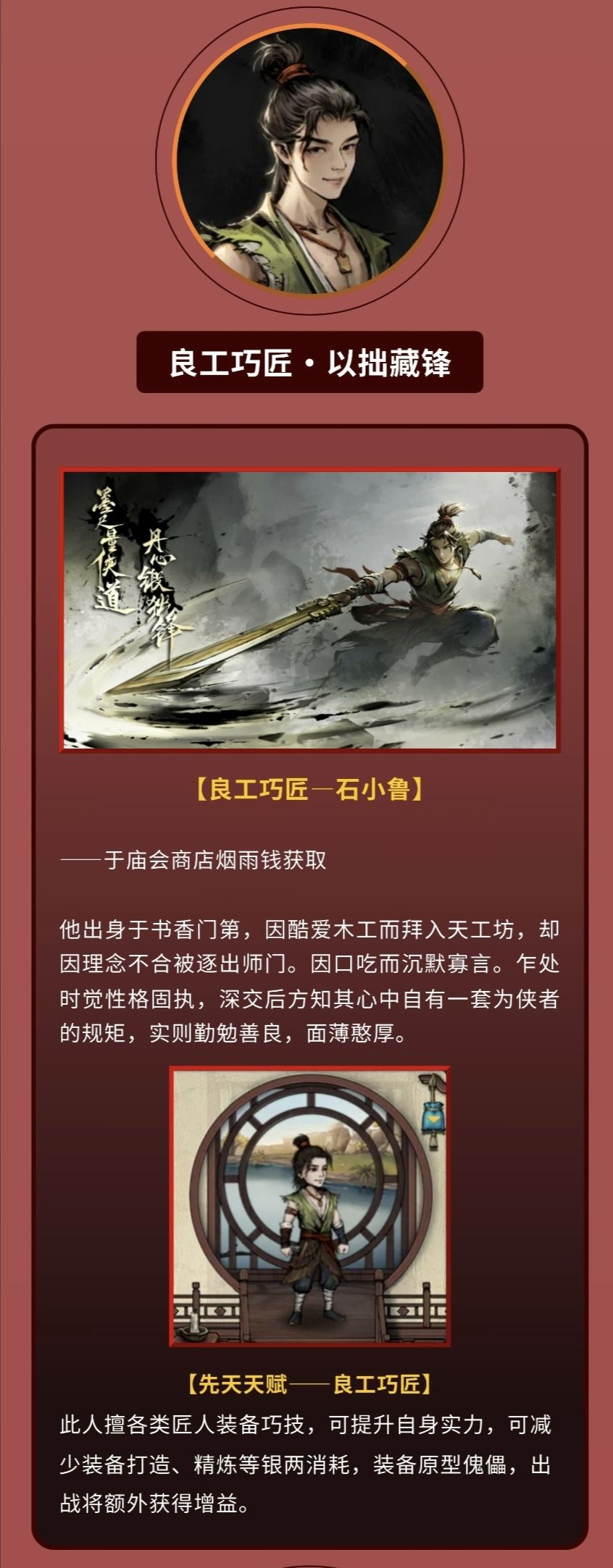 必拿的伙伴,可与白鹭,乞丐并称省钱赚钱三伙伴,强度也算不错,大概率500烟雨钱于商店获取,装备精炼一件大概3000银两,有他就是3000*5%=150,省一百五十两!而且能加持原神,适宜平民玩家使用。