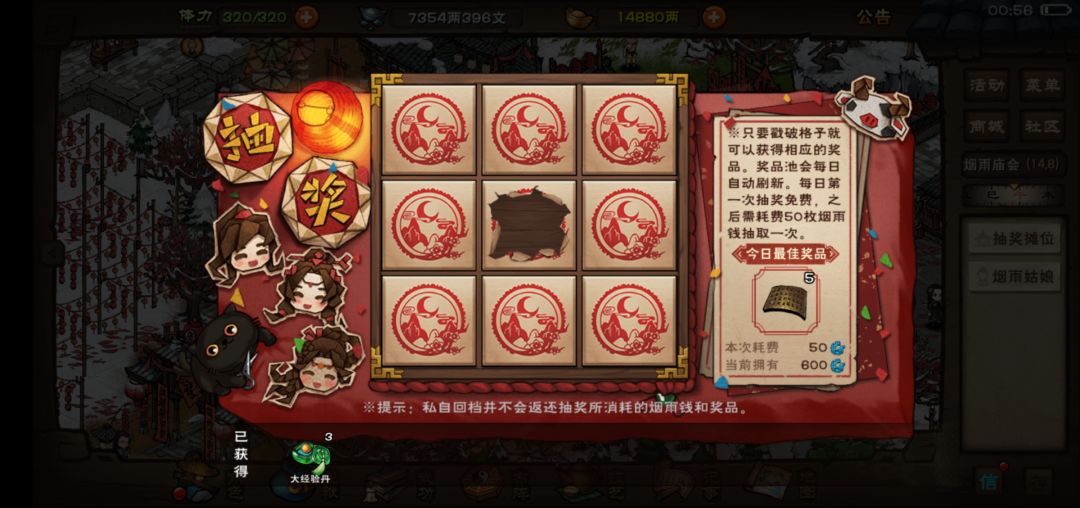各位不管欧皇还是非酋都看过来,九宫格是一个让人又爱又恨的活动,大奖每天刷新,第一次免费,而后一次50烟雨钱,部分大奖如5个功德铁券,2个功勋铁券,25顺脉丹,50洗髓丹等都是让人爱不释手,也是烟雨钱支出的一大重点内容,建议按自己包包里的小钱钱进行获取,不要上头,不要上头!!!