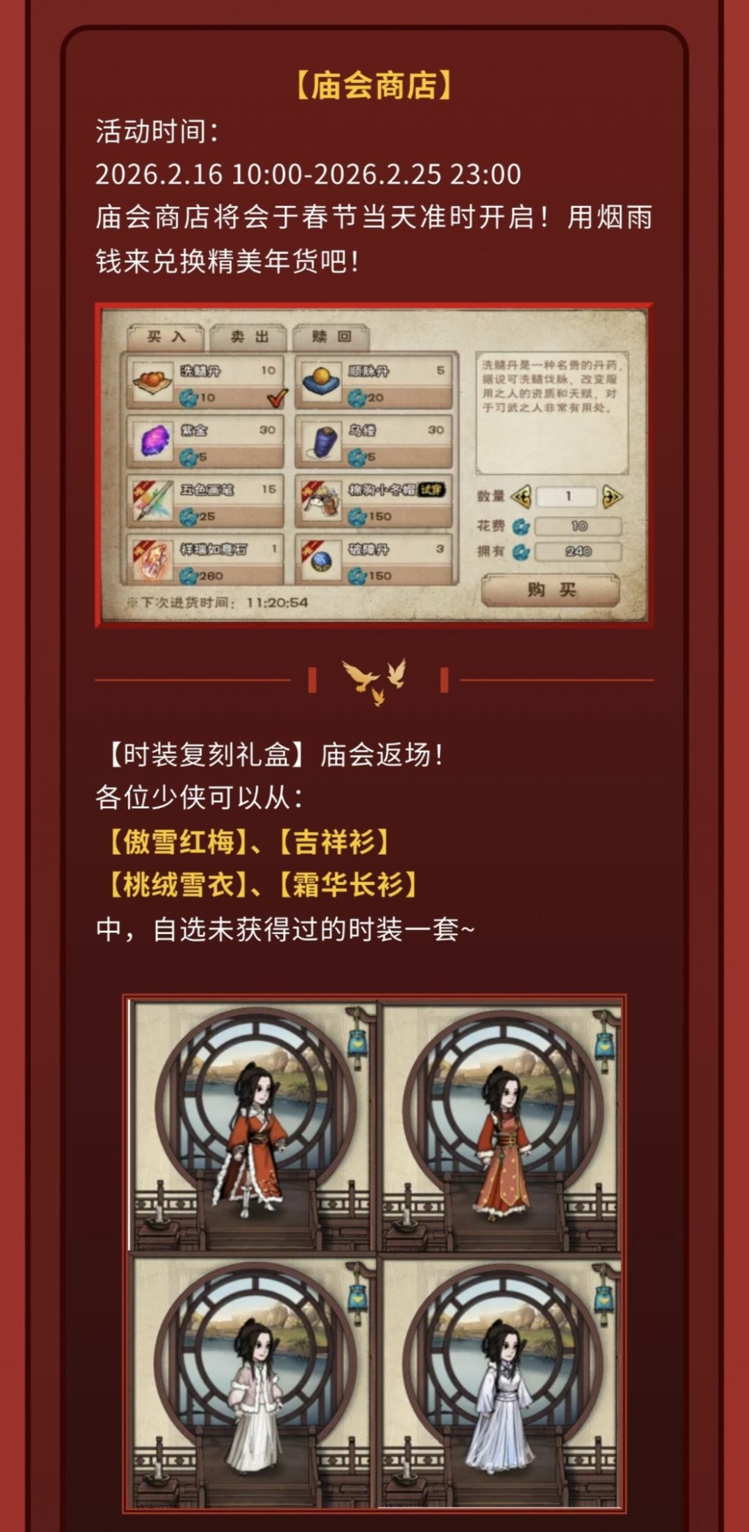 ⑪时装复刻礼包:320烟雨钱,限一,可以获取到一件往期的时装,看自身喜好购买(没有推荐不推荐的)