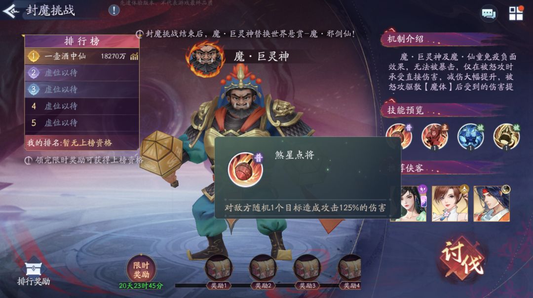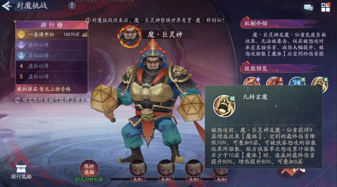 被怒攻前,魔・巨灵神及魔・仙童获得 9 层增益效果【魔体】,受到的最终伤害降低 10%,可叠加 9 层,可被侠客怒攻的驱散效果所驱散,敌方侠客单次怒攻累计驱散不少于 10 层【魔体】时,造成的最终伤害提升 80%,增伤提升 80%,可叠加 3 层