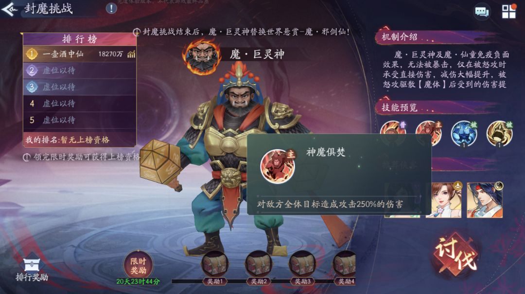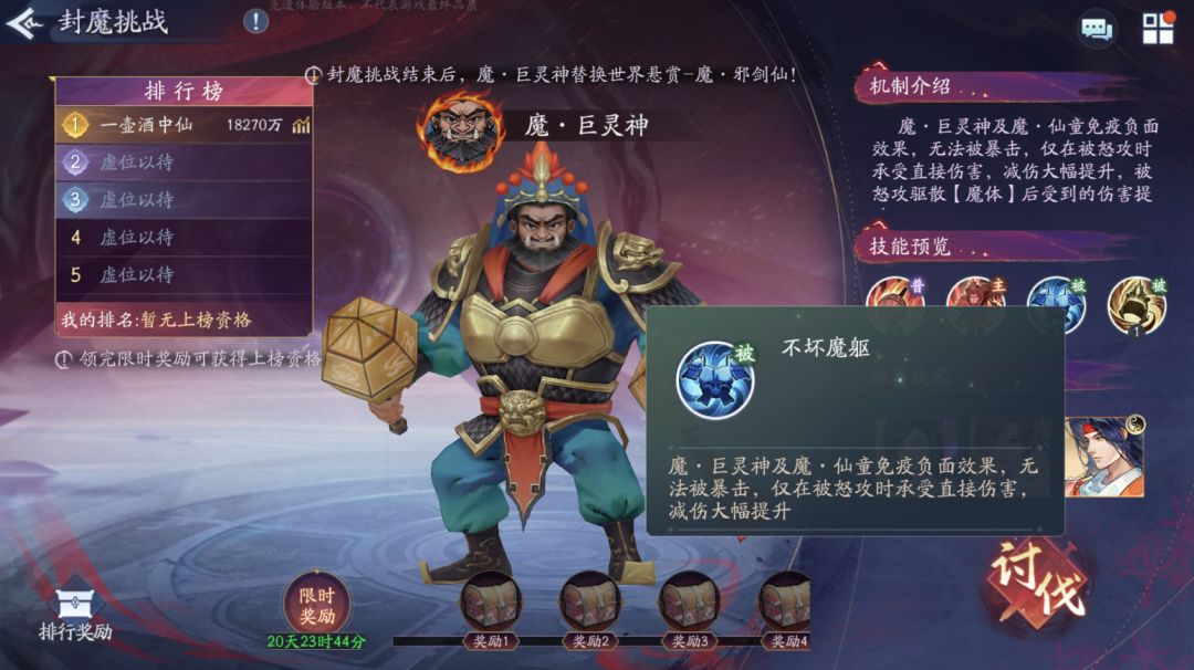 全新赛季,我们也迎来了新的封魔挑战——魔·巨灵神,解锁至世界悬赏后,将替换原有的世界悬赏——魔·邪剑仙