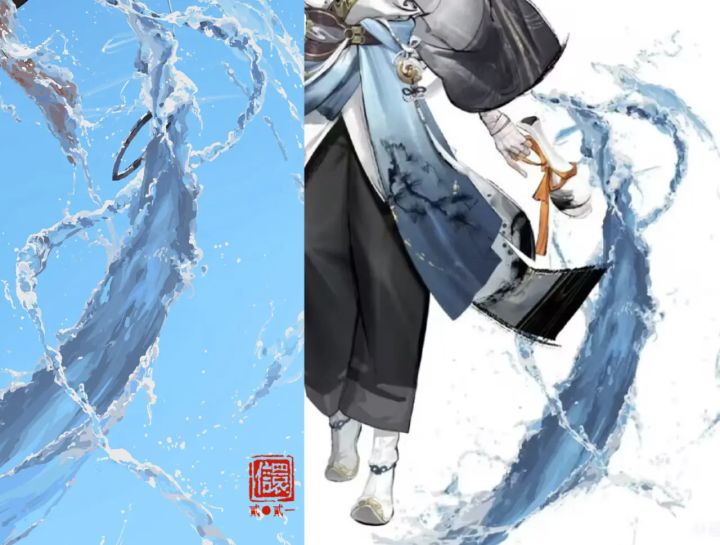 从画师放出的对比图来看,【诗剑行】皮肤中的部分水体特效,与“水巫-水吉”插画里的水系元素在形态、质感上高度重合。画师提到,这幅作品是其个人IP的重要组成部分,创作时在特效刻画上做了多次尝试,最终采用无压感笔刷风格,而皮肤中的相关元素被直接挪用,既未获授权也未标注来源。