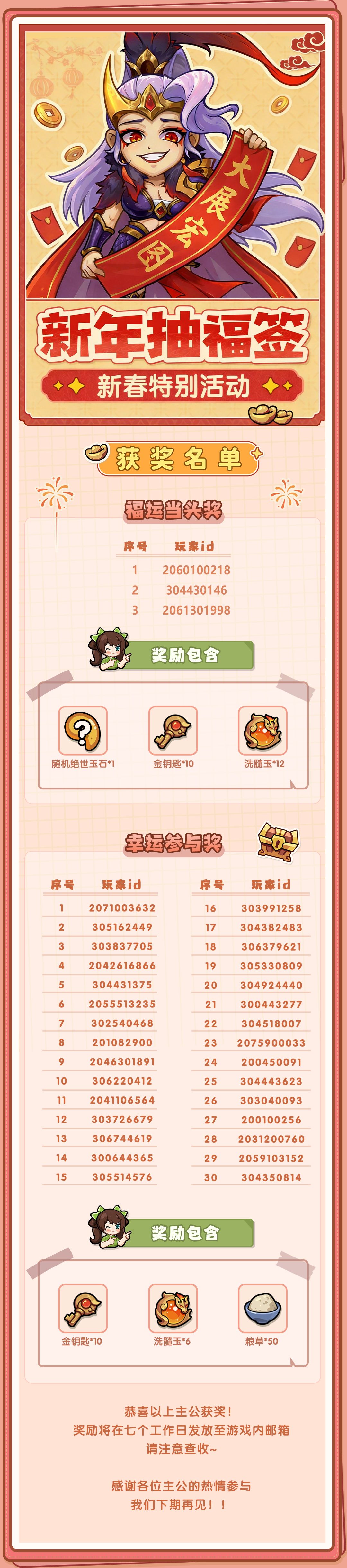 【中奖公示】恭喜以下主公在「新年抽福签」社区活动中中奖!奖品将在七个工作日内发放,请耐心等待,近期请注意查收游戏内邮件噢~