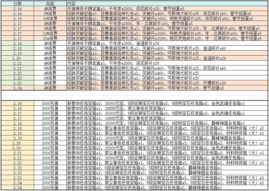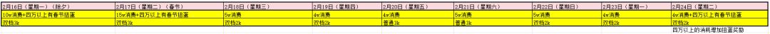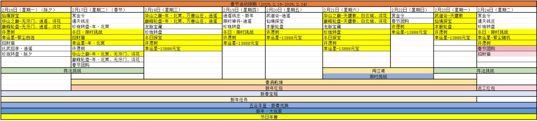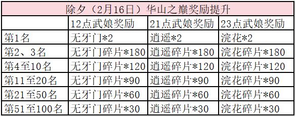14、除夕(2月16日)与春节(2月17日)的华山之巅活动,奖励均有一定提升,具体奖励如图所示: