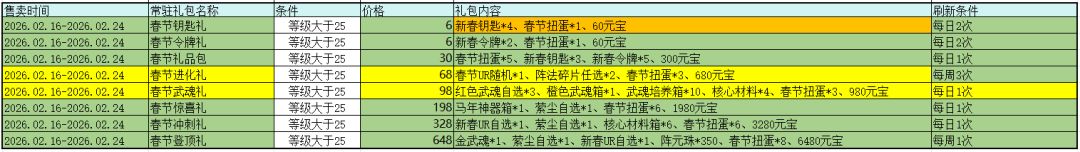 新春令牌:大玩家概率概率掉落,商城礼包、年兽兑换、春满乾坤掉落、激活码红包、许愿树、春节活动期间的团购兑换、春节饺子概率掉落。