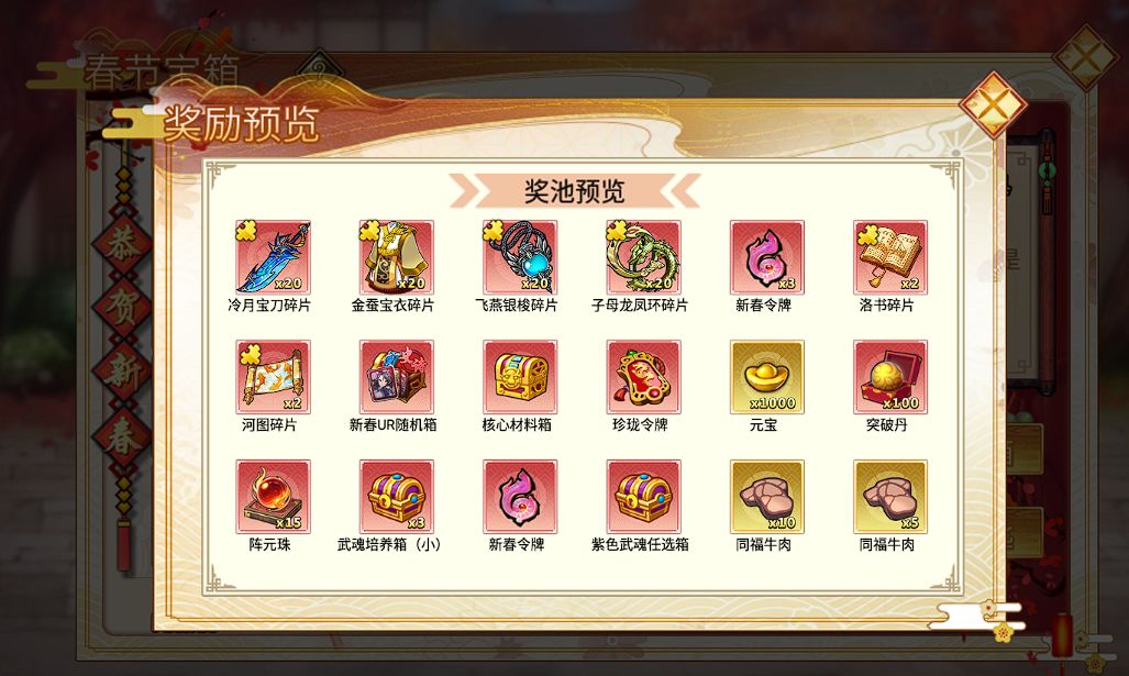 初级宝箱奖励:新春令牌*1、材料物资箱*3