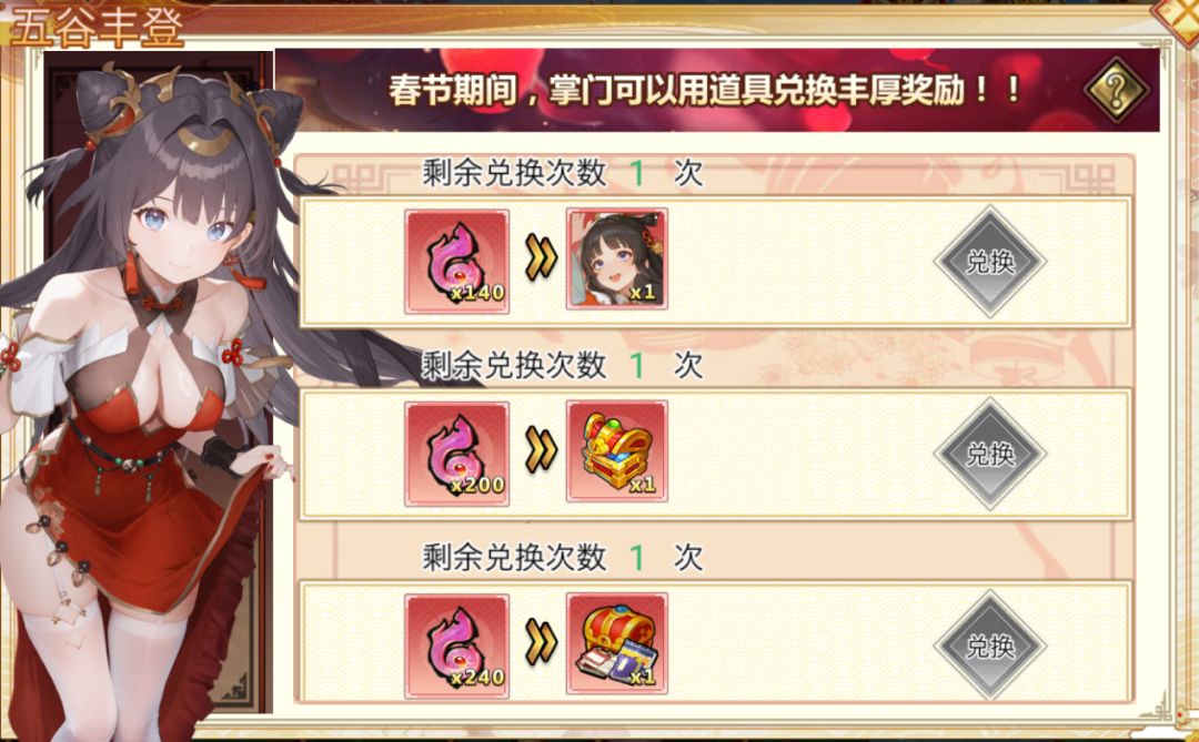 掌门可以通过在活动中游玩时获得的新春令牌来进行兑换丰厚的物资奖励。
