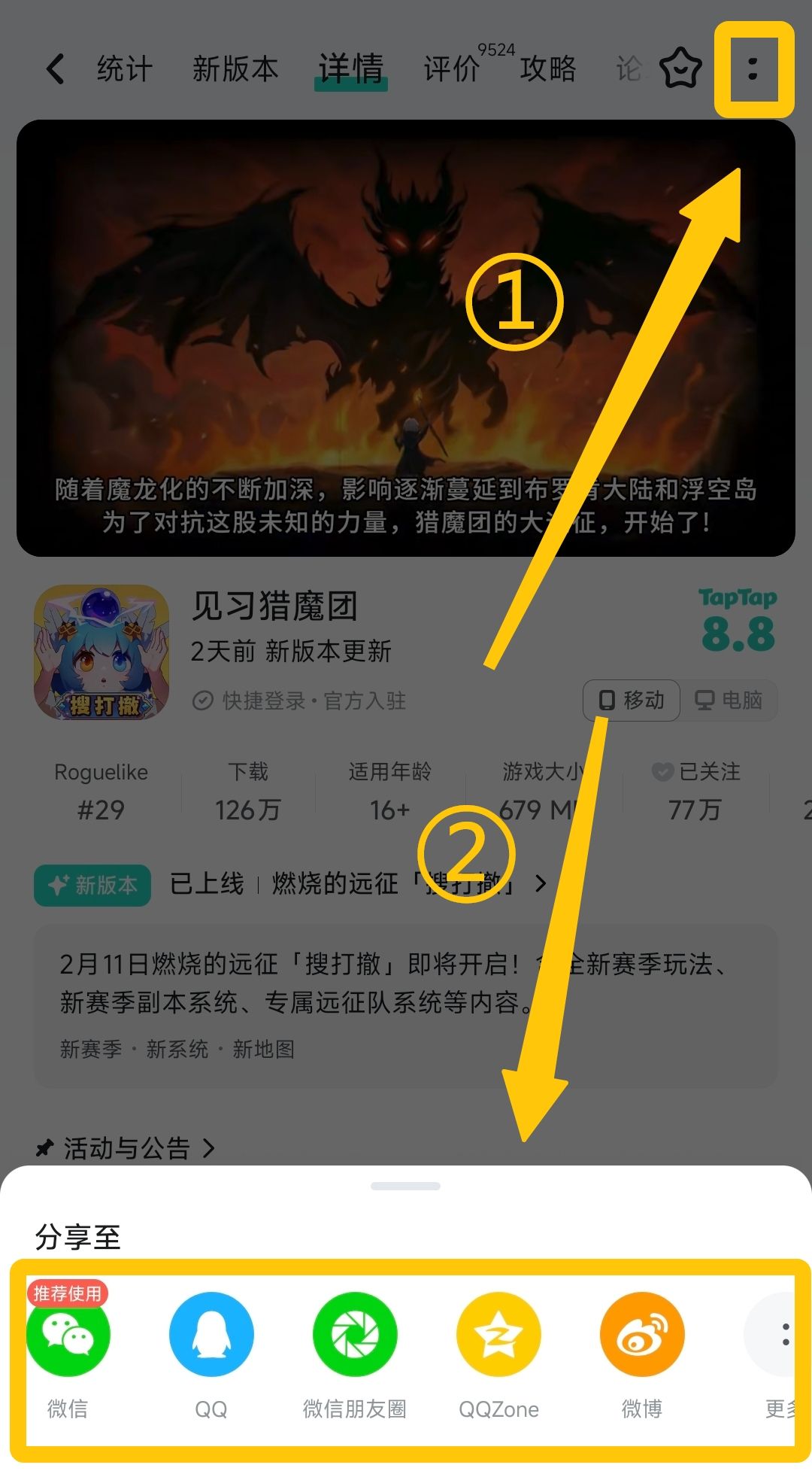1、下载&关注《见习猎魔团》,分享《见习猎魔团》TapTap游戏主页至微信朋友圈/微信群/QQ空间/微博/小红书/抖音/B站等其他社媒平台,