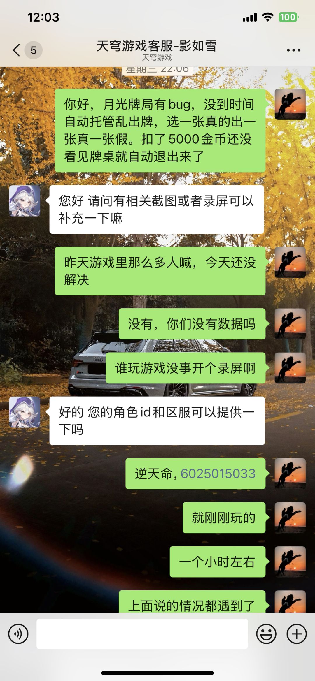 还有月光牌局的问题,本来出活动,对玩家来说增加新玩法是好事,但是一堆bug,耽误时间还损失金币。输3.4万金,不全是因为bug影响,但很影响心态,现在已经不玩牌局了。我看到有人在论坛反馈过了,官方也没有回复。反馈问题的人是真喜欢这个游戏,希望游戏越来越好