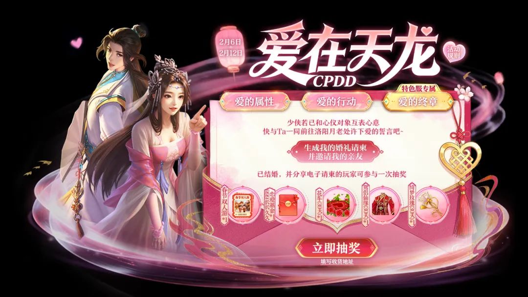 【爱的终章】活动专为修成正果的侠侣打造,携手你认定的TA,前往洛阳城找到月老,郑重许下爱的誓言,定格属于你们的江湖浪漫,还能生成专属电子婚礼请柬,邀请亲友共同见证这份美好,让全江湖都知晓你们的神仙缘分!