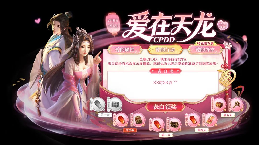【爱的行动】活动全程助攻,活动期间,每天向心仪的少侠发送一次深情表白,就能轻松解锁当日专属表白福利,虹耀石、神秘钥匙、动作自选礼盒等实用好礼,表白即得、日日有惊喜!既能拉近彼此距离,又能薅满福利,简直是一举两得,每一次表白,都是奔赴缘分的一小步!