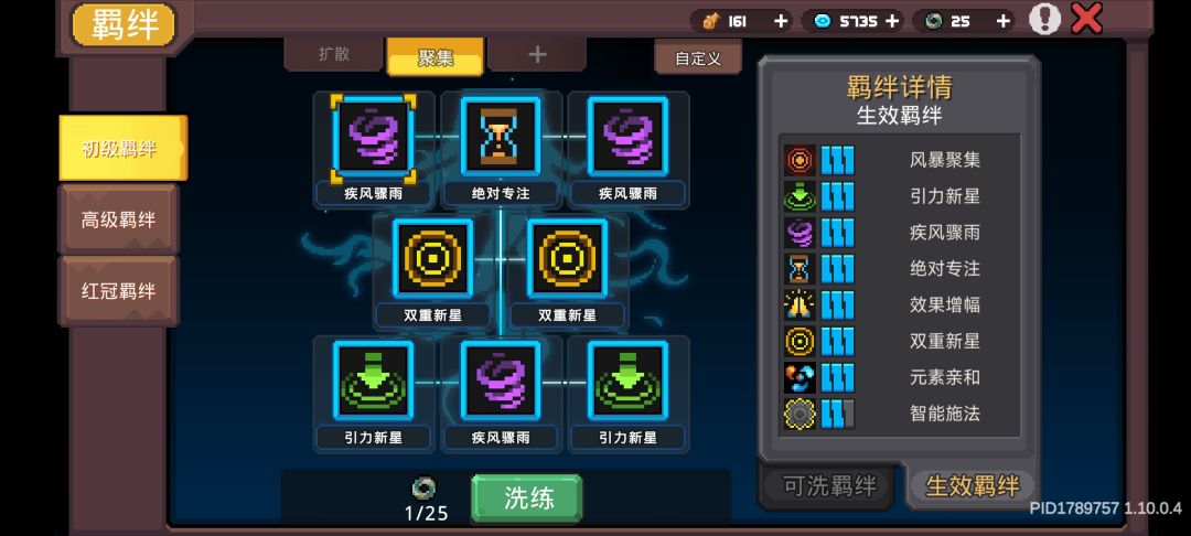 电龙卷能吃到范围和持续伤害羁绊必带双重新星和疾风骤雨,元素调和自身技能完美触发必带,效果增幅增加各种异常持续时间,自身被动超电力也可以吃到效果增幅,绝对专注前期装备密卷没做好先用着后期可以换成致命节奏/蓄势待发/元素核心,风暴聚集伤害提升且不像扩散那么光污染,龙卷风变小的情况下也更不会把电箭先吃掉导致怪物吃不到电箭的倒刺专精,两个智能施法给到龙卷风和电箭,如果电箭专精不带升压可以把引力新星给一级箭矢改良,我这装备没做好还有1个红冠位没用上,后续打算洗出三级致命节奏/蓄势待发只带一级引力新星或者二级专注二级引力。