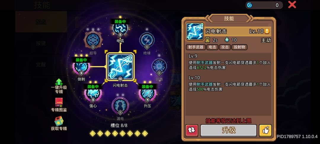 电箭专精,倒刺满级45%范围伤害总增,升压给电箭上穿刺,强心电箭暴击推进技能冷却刷龙卷风冷却,电弧增加射出箭的数量,电龙卷会吃掉射出的箭会导致倒刺无法触发到怪身上,必须要给电箭穿刺效果,不想用升压可以在羁绊上洗个一级的箭矢改良效果不会差太多,对比了刷图效果和羁绊位吃紧我这里选了用升压。