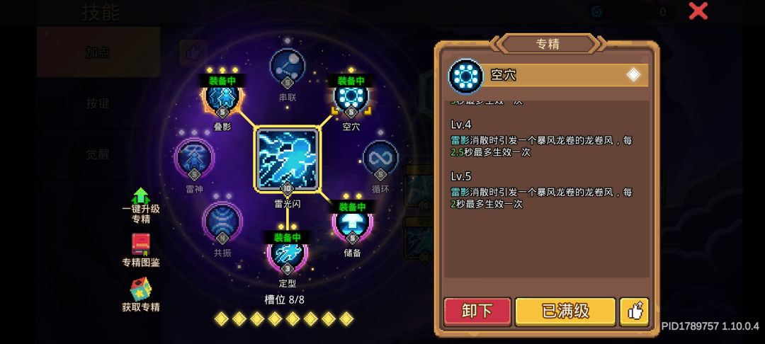 雷光闪专精,叠影45%技能伤害总增,定型增加影子持续时间和减冷却,储存增加位移距离增加充能次数,空穴增加产生龙卷风,储存和空穴配合圣魂每次位移产生两个龙卷风。