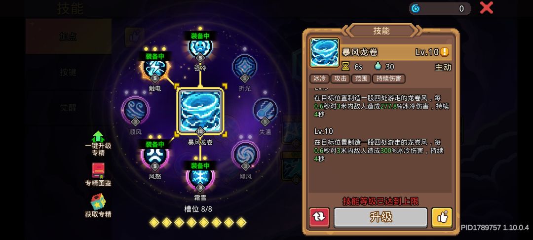 技能加点如图,冷酷适应的点数正常是要给风暴潜能点满的,目前装备没做好点满保持不了满暴击率先这样点,风暴潜能后期暴击率够高把它点满。
