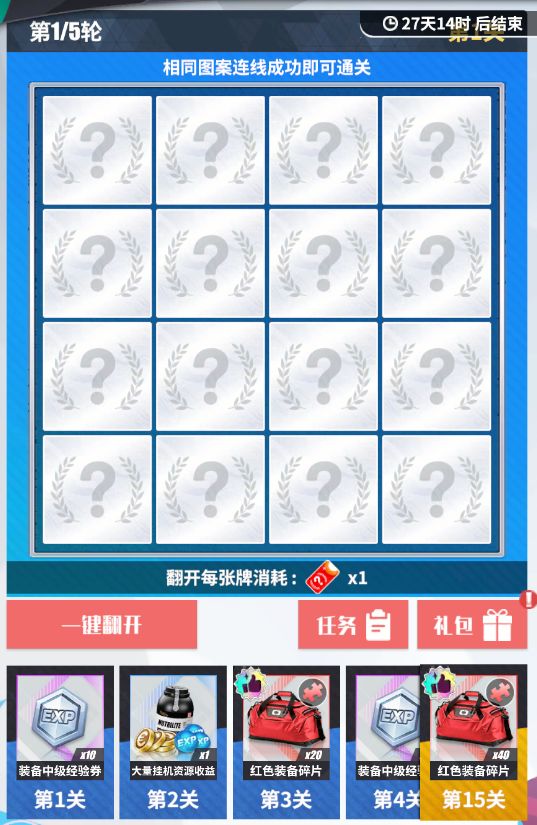 活动内容:完成任务即可获得幸运乐翻卡,可用于在幸运乐翻天活动中翻开一个格子,相同图案连线成功即可通关,完成一定关卡即可领取红色装备碎片!
