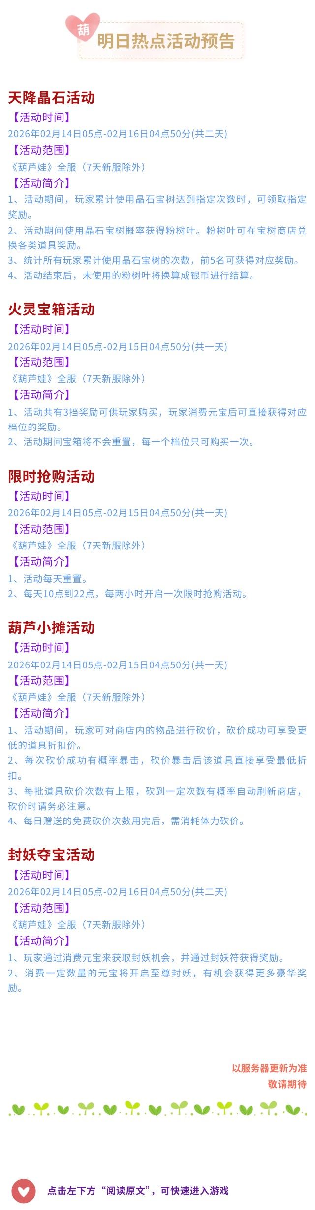 【葫芦娃】2月14日活动预告