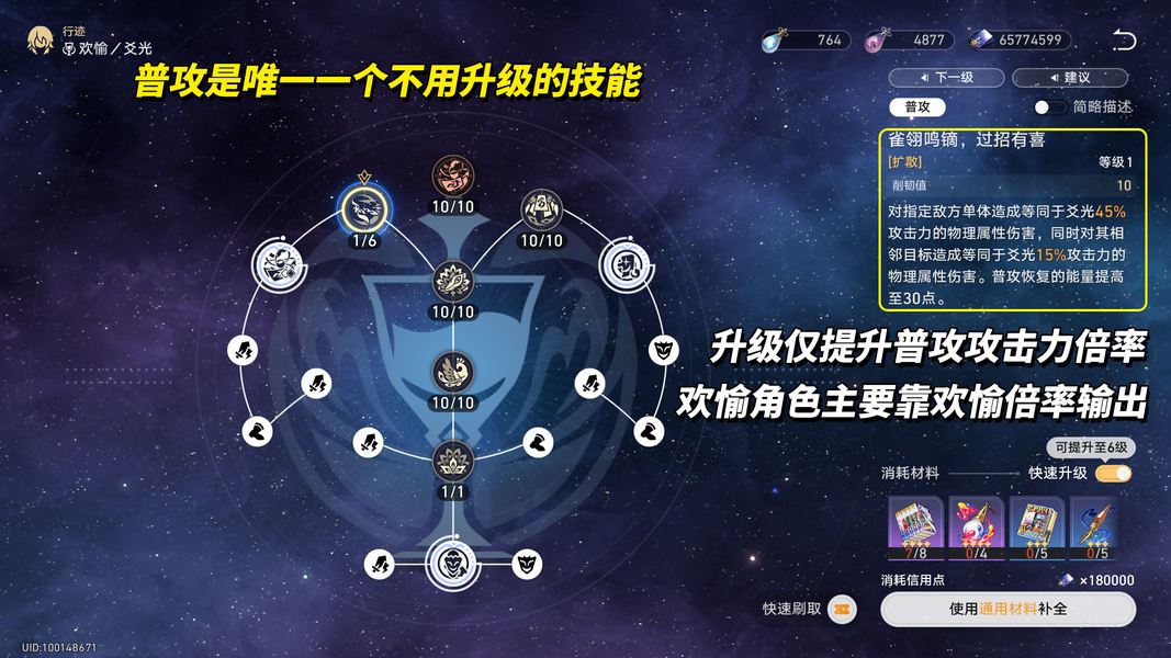 「欢愉」角色的伤害主要和欢愉技能倍率挂钩,爻光的普攻升级仅提升攻击倍率,对伤害的提升基本无影响,因此普攻可维持1级。其余技能尽量升满,涉及增幅数值或欢愉倍率等。