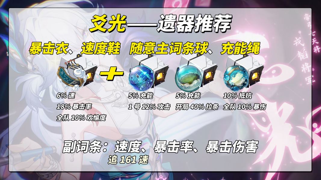 遗器推荐组合:隧洞4件套「应天涉远的卜者」暴击衣、速度鞋+位面2件套「沉陆海域露莎卡/生命的翁瓦克/折断的龙骨」随意词条球、充能绳。