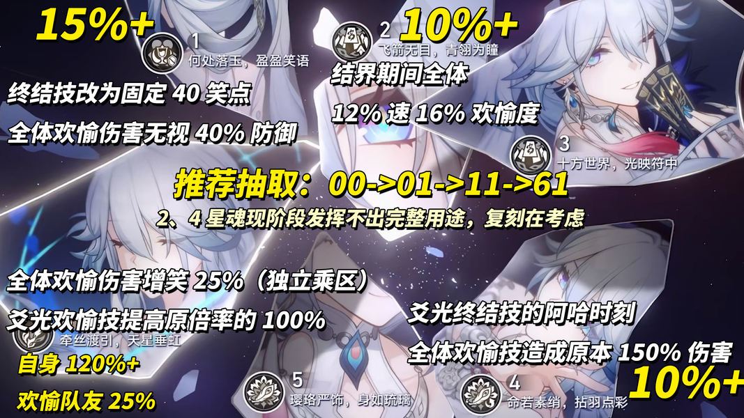 4魂提升10%+,终结技的额外阿哈时刻期间造成的全队欢愉技为原本150%。爻光终结技180耗能,触发4魂效果并不频繁,相当于多个爆发手段吧,只是给后续6魂提高爻光输出做铺垫。