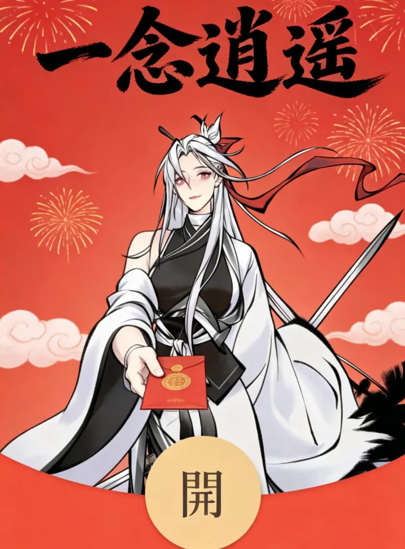 【指令②】人物向前递出一个红包,背景是大红色,带有祥云和绽放的烟花,顶部有黑色水墨书法字体“一念逍遥”,底部有一个圆形金色“開”字按钮,整体是微信红包封面风格,喜庆春节氛围,低饱和度色彩,细节精致,构图居中对称,比例3:4