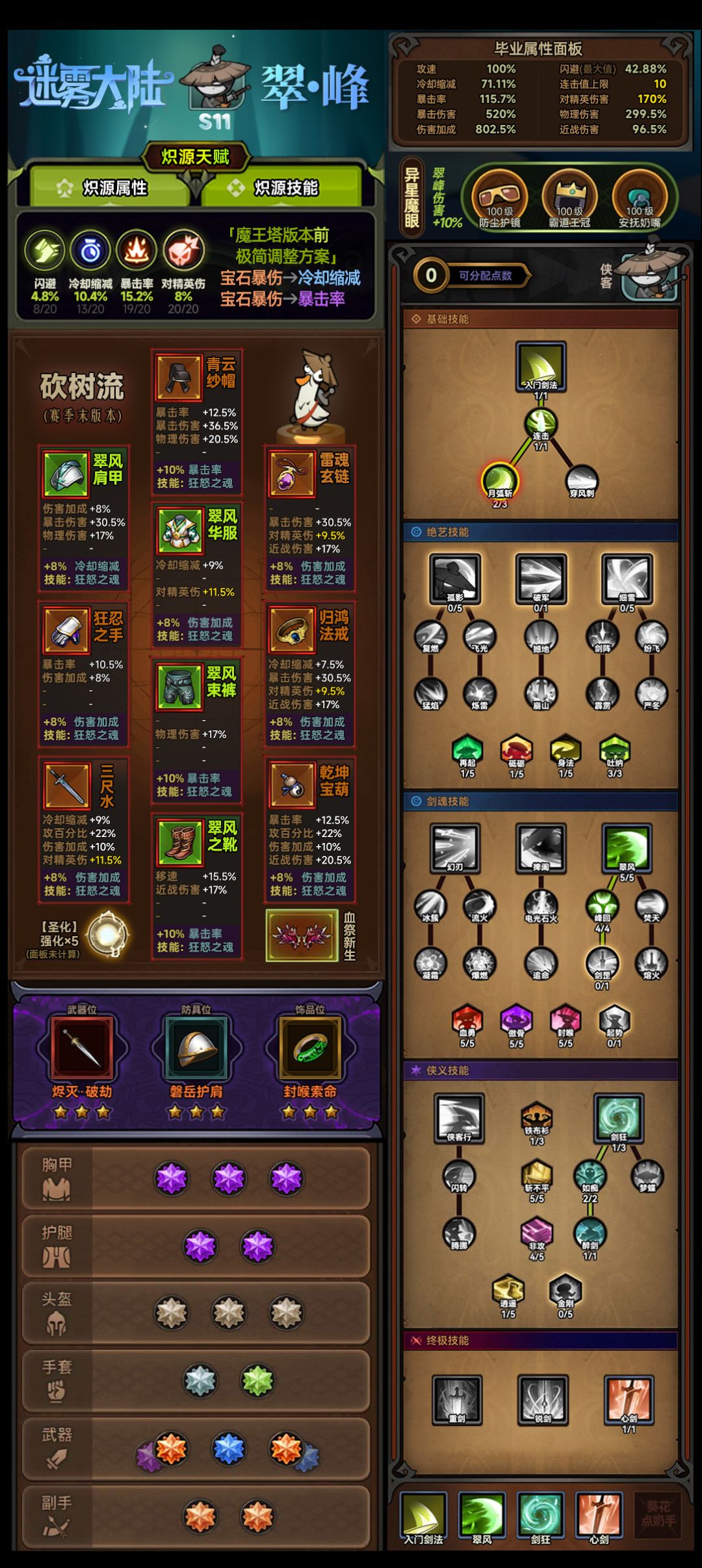 上图大概能反应出,相对于小怪推图进度,翠峰击杀BOSS的速度还是相当快的。根据圣化必有一个强势流派的潜规则,S12赛季大概率会在幻刃-流火和翠风-峰回中择一圣化。且幻刃和翠风都是侠客最适合开荒的流派,各位可以提前了解下。
