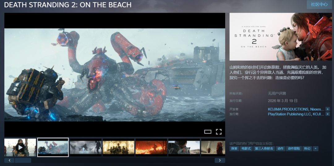 今日早些时候,索尼State of Play发布会上,小岛工作室正式官宣旗下新作《死亡搁浅2:冥滩之上》登 PC平台,同步放出一支全新预告片,引发全球玩家热议。目前,该作Steam商店页面已正式上线,即日起开启预约,定于3月19日正式发售。
