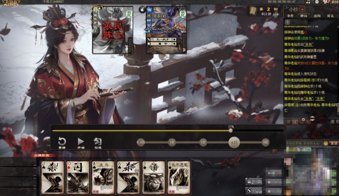 更进一步,由于【定安】的目标是“手牌最多的其他角色”,因此给对方角色发牌也是一个很不错的选择。无论是【定安】还是【抚宁】,都可以优先给要打击的角色发牌。而注意到【抚宁】是定向给牌,因此可以给目标大量的杀或闪,再触发【定安】拆牌,来达到清除对方手中杀或闪的效果。以本局为例,