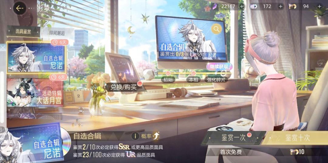 本次可选UR面具:撒切尔、尼诺、谢安桐、苏遇荼、因罗。选定后活动期间不能更改,艺人们在自选合辑内鉴赏出UR时,将有30%的概率为自选面具,同时,在自选合辑中鉴赏3张UR面具必含该自选面具。