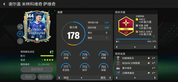 以144的25赛季最佳米林科维奇为例,两人均为身高超过1米9的高大B2B中场,身体对抗与制空能力出色,兼具远射威胁与长传调度视野,能覆盖攻防两端,承担攻防转换核心角色。