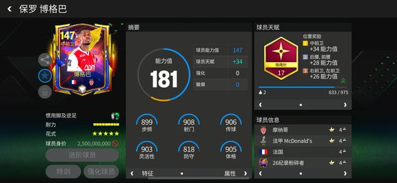 特性方面,天赋异禀、长传大师、盘带大师、组织者、花式传球让博格巴拥有极高的长传精准度和持球时的进攻策动能力。远射大师则让博格巴拥有极强的得分能力;除此之外,博格巴还配备了铁人、铁肺两项特性,加强了身体对抗和比赛75分钟落后时的体力恢复。