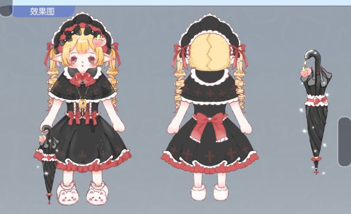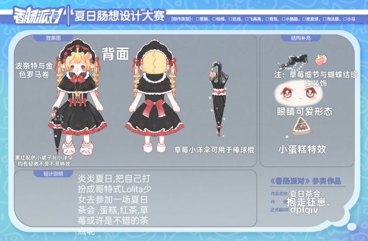 设计理念:炎炎夏日,把肠肠装扮成去茶会的哥特风少女,撑着草莓洋伞,吃着蛋糕,草莓,品着红茶或许是场惬意的午后呢(衣服参考哥特Lolita)
