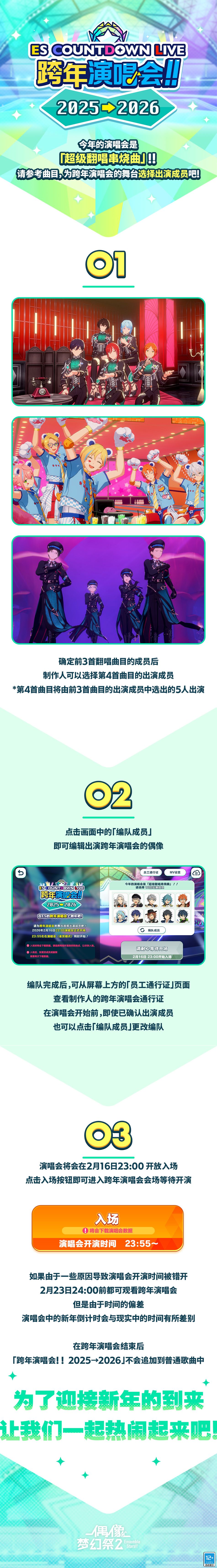 2026年2月17日 00:00~2026年2月23日 24:00期间,制作人可反复游玩「跨年演唱会!!2025→2026」活动的内容。