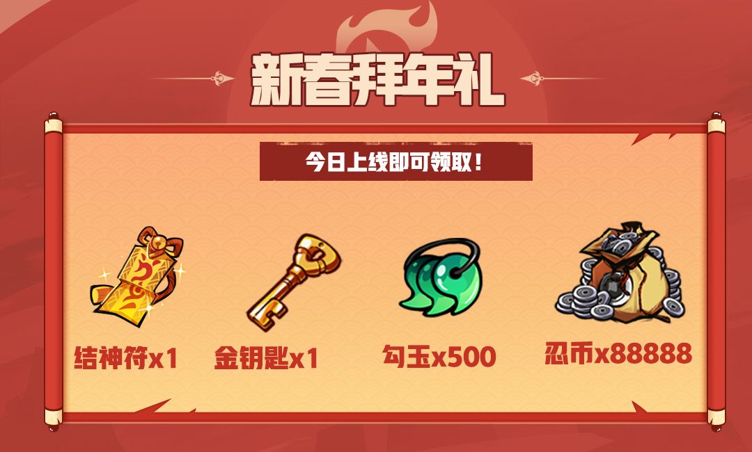 今日登录游戏,即可在邮件内领取一份新春拜年礼,内含结神符×1,金钥匙×1,勾玉×500,忍币×88888,忍忍们请及时前往获取哦!