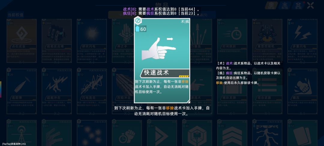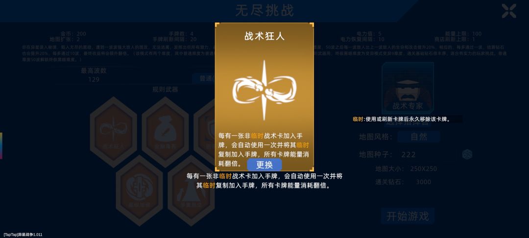 超武黑暗无尽开局最大的困难是能量消耗,用不了几次就卡手,因此可以携带规则“战术狂人”。该规则的效果是:每有一张非临时战术卡加入手牌,会自动使用一次并将其临时复制加入手牌,所有卡牌能量消耗翻倍。