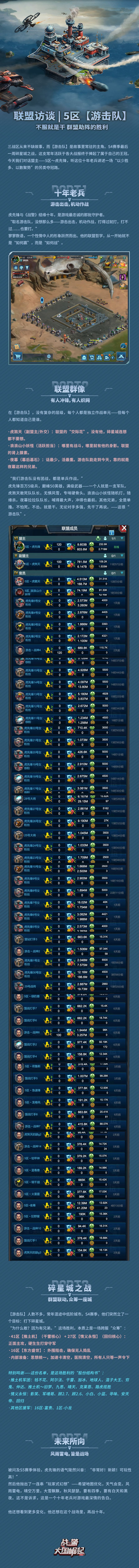 三战区从来不缺故事,而【游击队】是故事里常驻的主角。S4赛季最后一周碎星城之战,这支常年活跃于各大战报终于捧起了属于自己的王冠。今天我们对话盟主——5区~虎先锋,听这位十年老兵讲述一场“以少胜多、以散聚势”的另类夺冠路。