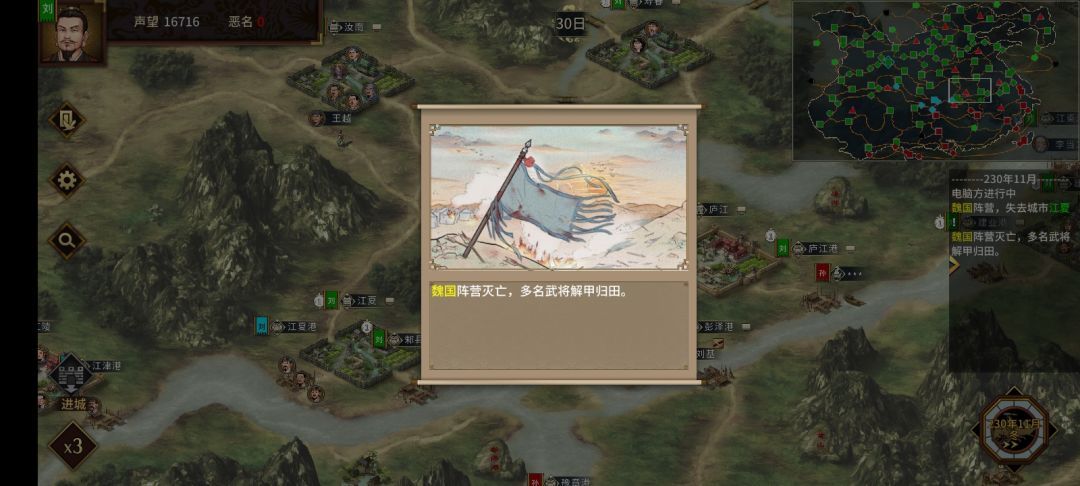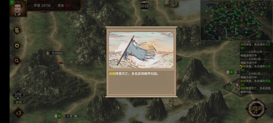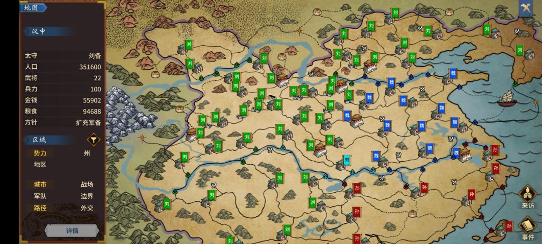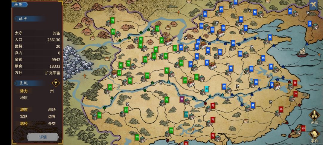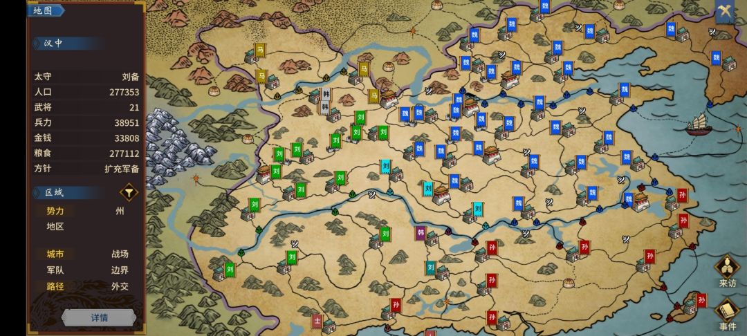无自建无英灵,开局一座城,带你从破局到统一!历时一周总算是打完了,游戏时间总共是过了二十七年,感觉高难度下算快的了,sl的次数还是比较少的,这边就给想挑战自己的朋友提供一点思路。开局的话趁着六个月的出征保护期,解散骑兵拉轻步轻弓,占掉上庸,把武将全部移动过去,新野留几个武将就可以了,主要是想贪一下第四个月征的第二波兵,内政赈灾不用管,只搞有恶名的。等到曹操来打我们的新野,就带着所有的兵力出征上庸,把新野丢给曹操和刘琦去抢,然后开始贷款爆兵,原地出征勾引张鲁出小波兵来打,慢慢消耗张鲁的兵力,等到消耗差不多了就一举夺下汉中,接着往南打刘璋,为了避免陷入左支右绌,建议拉联盟分担曹魏大军带来的压力,前期我们很弱的情况下其他人一般不会撕毁盟约。打刘璋的话可以用空城计消耗,也可以直接打(出征自己再改目标),如果那个城市电脑的兵力大于三万的话,它就会派多于三万的部分来出城迎击,我们就可以趁势打野战吃掉这一部分兵力,用这个方法也可以很快的判断电脑的兵力,因为情报点获取太少,铺的还没打的快。攻城的话需要两到三倍的兵力去打,电脑免伤太高,主要的伤害来源就是特技和响应攻击,建议用丞相,张飞,关羽加另外三个任意武将,后面把姜维加进来后最好就不要变动了,打到哪驻扎到哪。前期的话我喜欢半自动攻城,进去放完特技清掉骑兵之后就自动。因为电脑伤害太高,攻城器械脆的跟纸一样,破城门就不要想了,又没有什么好用的特技用来攻城,还容易被控,墙都不一定爬的上去,我个人感觉是不如两三倍兵力开自动推。期间如果上庸守不住就直接放掉,在成都和汉中屯兵,其他城派武将自动代理,科技点了把刀盾强弩搞出来。慢慢收掉益州之后,主力转火北上去打马腾韩遂。这样一套打下来我们就占了将近半数之地,有能力和曹魏一较高下了。和别的档破局后直接平推不同,打曹魏还是很有挑战性的,因为战线拉的很长,从洛阳—上党一线取东北的过程中侧面肯定会一直被袭扰(有时候一过月七八队来打也是正常的),和别人边境空城不同,我喜欢在边城屯兵,这样电脑就会派更多兵来打,它城里的兵也就越少,这时候其他城出征电脑出兵的城市就可以逼迫电脑的军队回援,虽然是援兵之计不能消耗电脑兵力,但是可以为北伐争取时间(垃圾一点的将领带两三倍兵力守城都要打半天),南边就用强制停战按住孙权,单城势力不用管,后面劝降。打完东北那一块后(也是最难打的)就差不多稳了,直接举全国之力南下光复汉室。