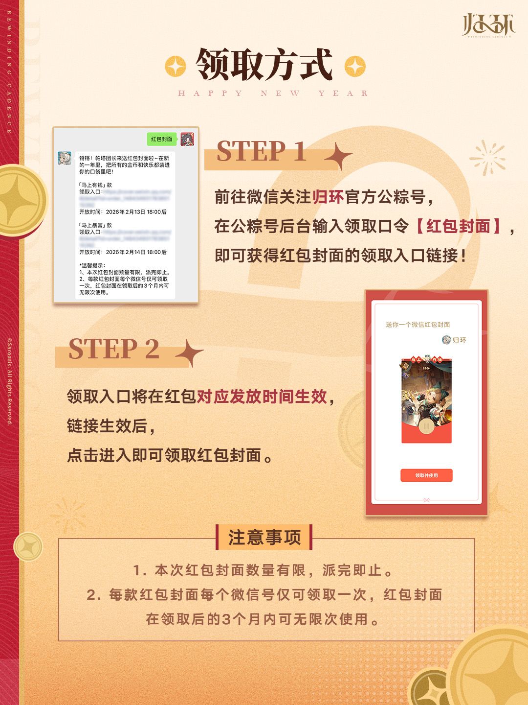 - 领取入口链接将在红包对应领取时间生效。链接生效后,点击进入即可领取红包封面。