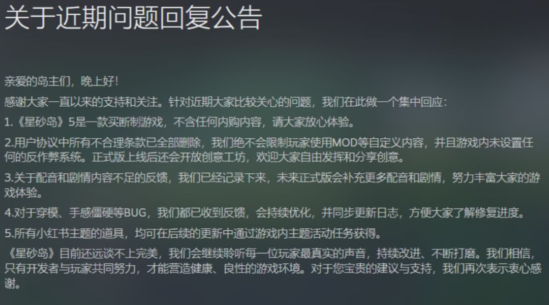 此外,官方逐一回应玩家关切:《星砂岛》为买断制游戏,无任何内购内容;已删除用户协议中不合理条款,不限制MOD等自定义内容,正式版将开放创意工坊;已记录配音与剧情不足的反馈,正式版会持续优化;穿模、手感僵硬等问题已着手优化,后续将同步修复进展;所有xhs主题道具,后续均可通过游戏内主题活动任务免费获取。