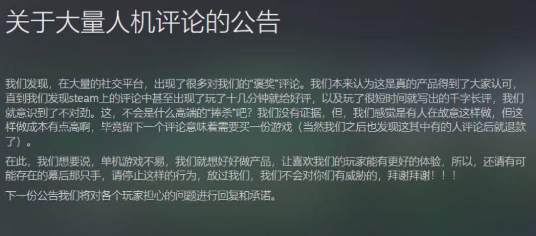 近日,《星砂岛》官方连发两则公告,针对游戏首发后出现的人机评论乱象,以及玩家关心的诸多问题作出集中回应。官方指出,社交平台与Steam平台涌现大量异常褒奖评论,部分账号仅游玩十几分钟就给出好评、快速产出千字长评,甚至评论后立即申请退款。官方表示不确定该行为是否为 “捧杀”,恳请幕后操纵者停止此举,并称单机游戏研发不易,团队只想踏实做好产品。