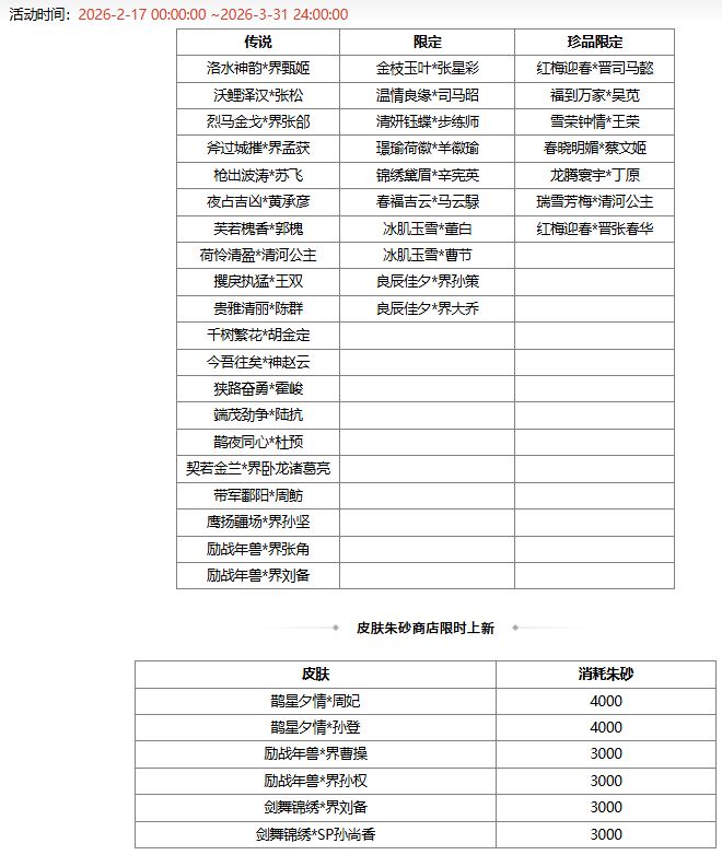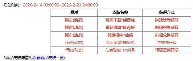 *2026-2-14 00:00:00 ~2026-2-23 24:00:00,伶俐雀跃*赵襄动态包 180夺宝碎片、清涛着墨*族王沦 100夺宝碎片 限时上架夺宝商店。2026-2-24 00:00:00 起,伶俐雀跃*赵襄动态包、清涛着墨*族王沦下架。