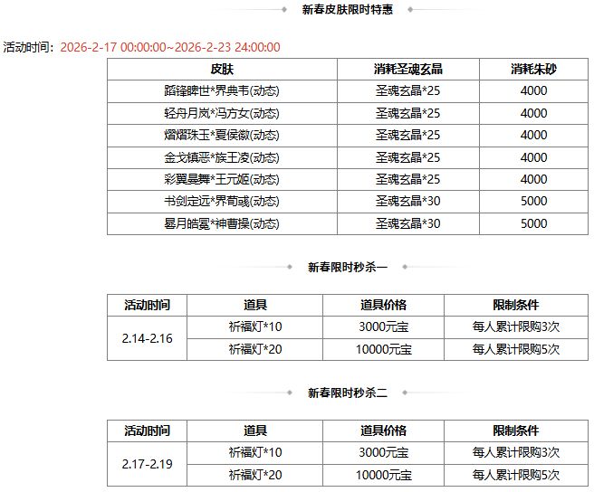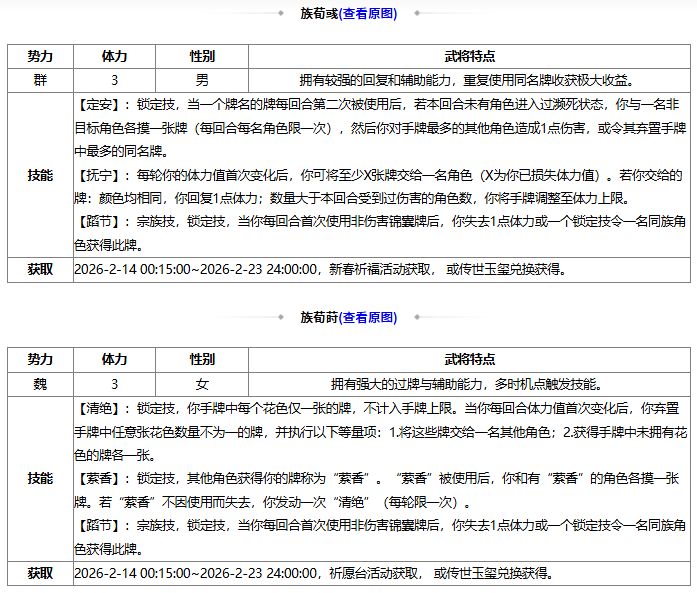*本期上新 马年龙珠(族荀莳)、新春龙珠(SP刘备),返场 早秋龙珠活动(闪刘宏)、踏春龙珠活动(谋文丑),龙珠可购买时间:2026-2-14 00:15:00~2026-2-23 24:00:00;