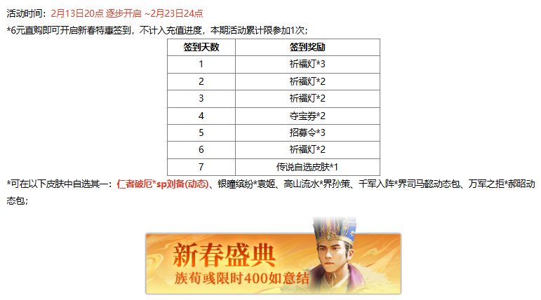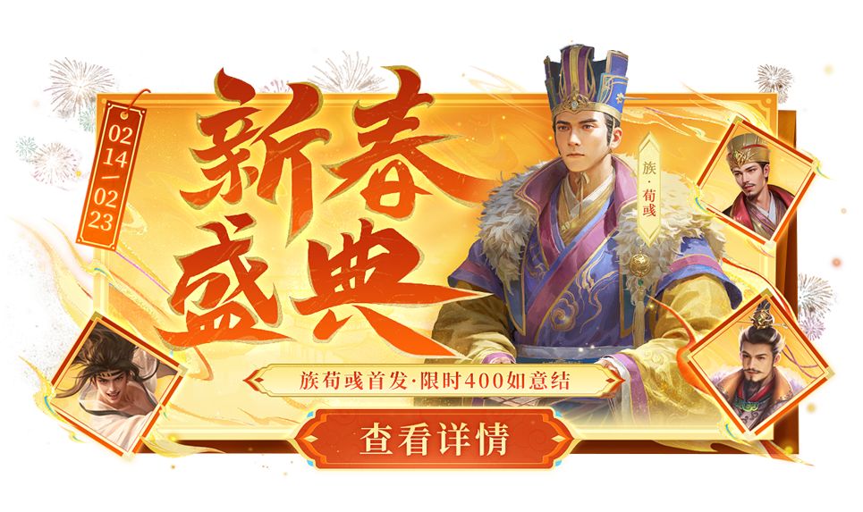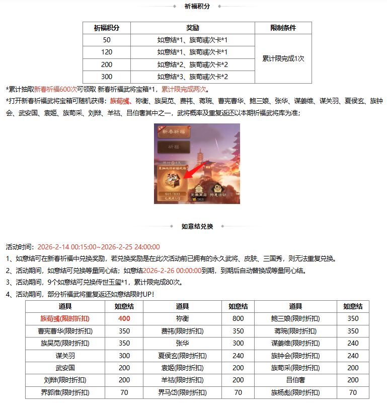 1、新春祈福 限定武将族荀彧上新,幸运时刻限时开启,累计抽取可得祈福库武将!