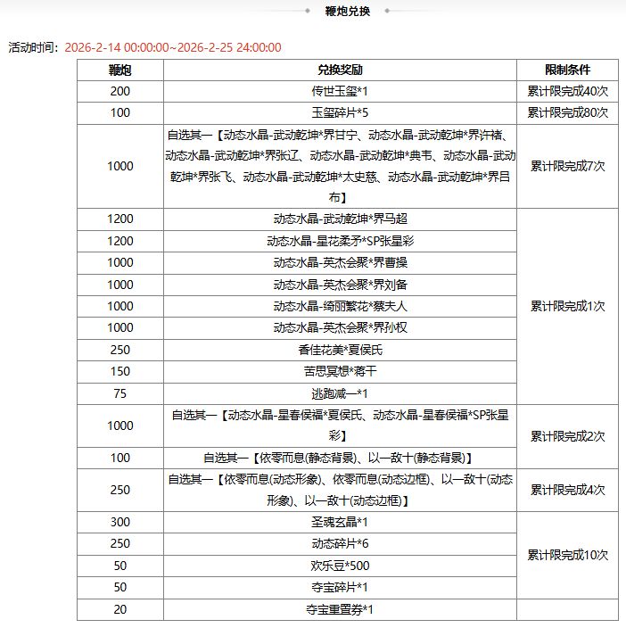 1、鞭炮可兑换奖励,若兑换奖励是在此次活动前已拥有的永久武将、皮肤、三国秀,则无法重复兑换;