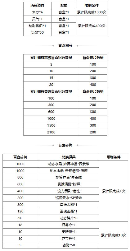 1、盲盒自动打开,开启盲盒必得普通盲盒积分*1或高级盲盒积分*1,并同时获得随机道具;