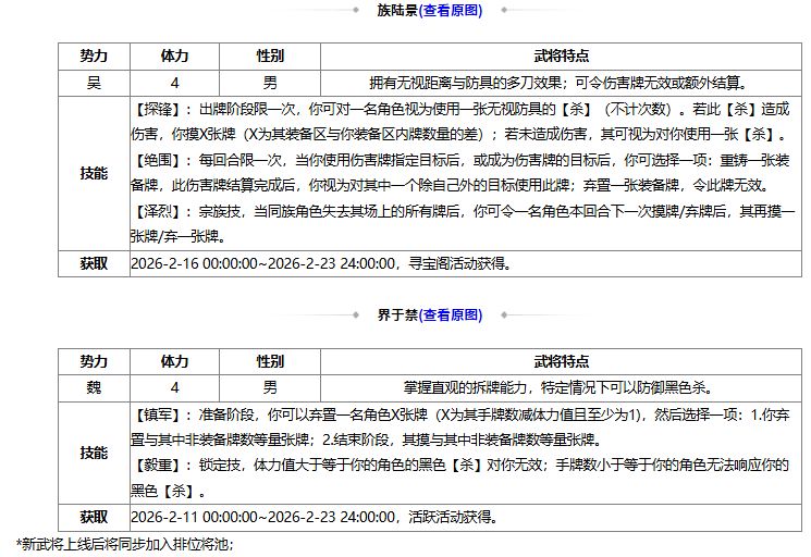 *2026-2-13 18:00:00 ~2026-2-23 24:00:00,族王沦 800灵宝、曹嵩 1200灵宝、界典韦 400灵宝、蒋干 800灵宝、杨修 1400灵宝、SP张辽 600灵宝 限时上架灵宝商店;