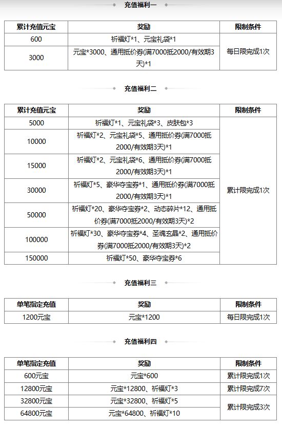 1、庆新春首充双倍重置,指定档位限时翻倍返利!