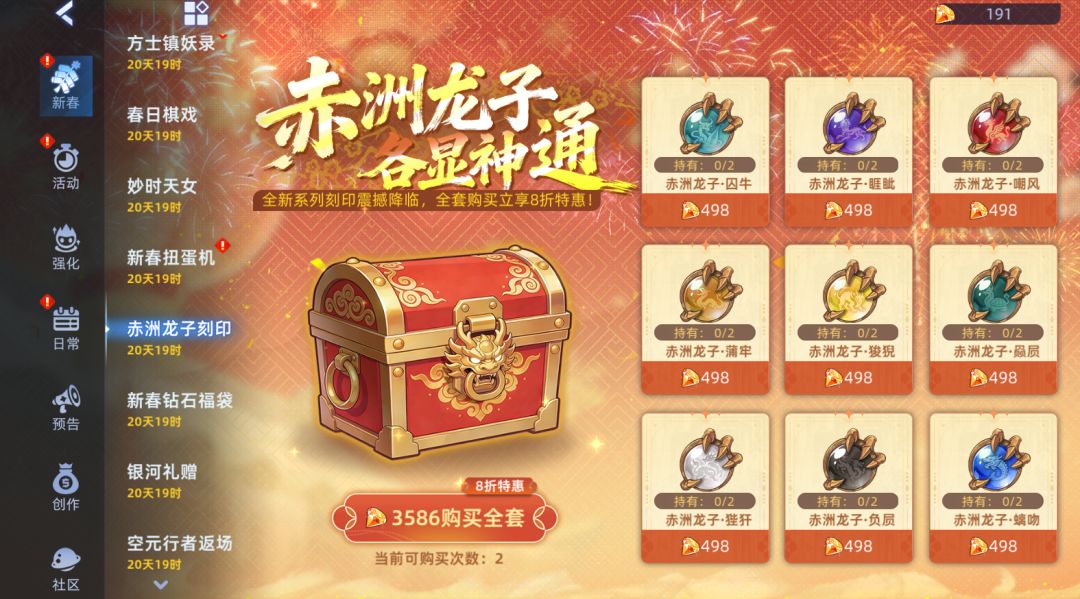 完成每日签到,赤洲龙子刻印自选礼盒α、赤洲龙子刻印自选礼盒β、马年限定