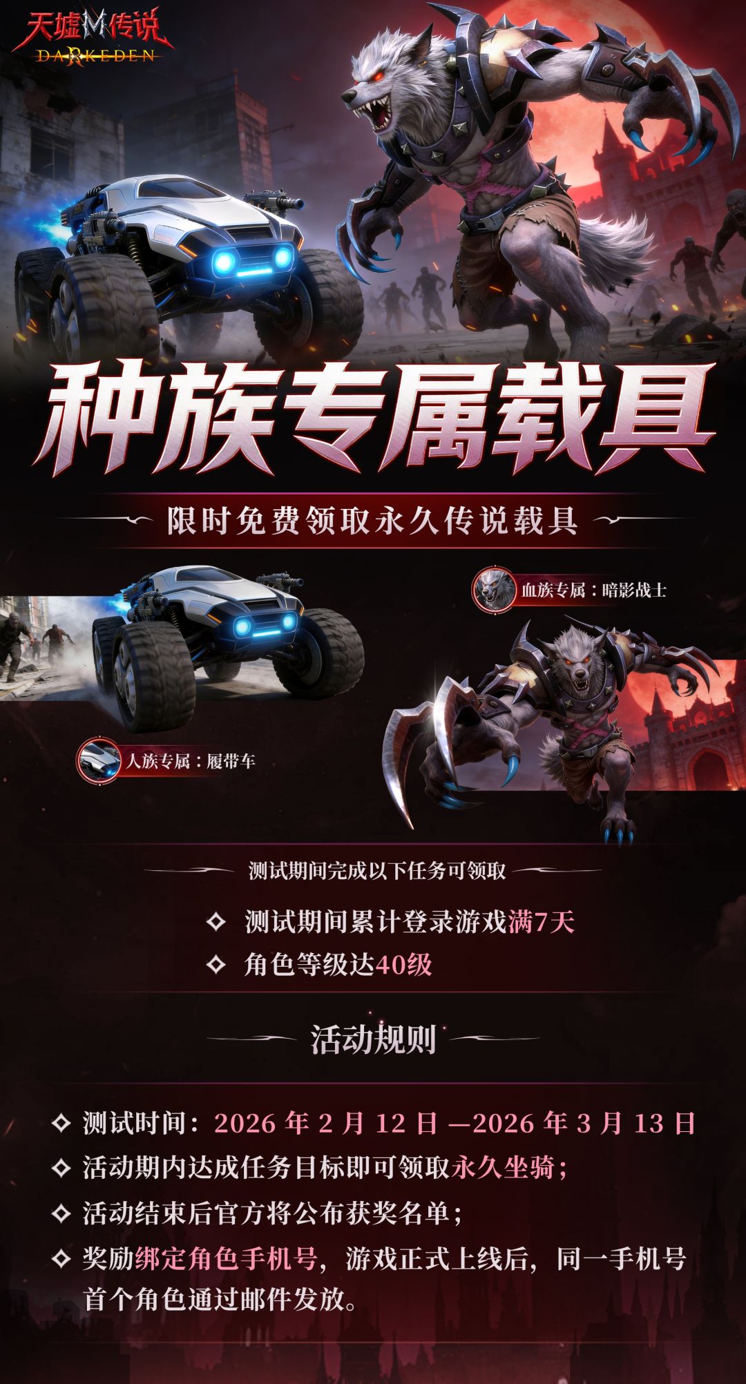 参与「绯月测试」期间累计登录7天,且角色等级达40级,即可领取对应种族永久载具。【活动规则】