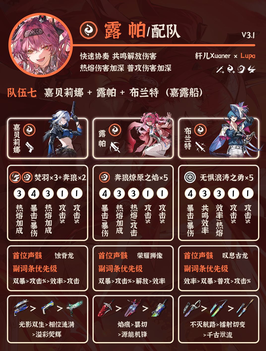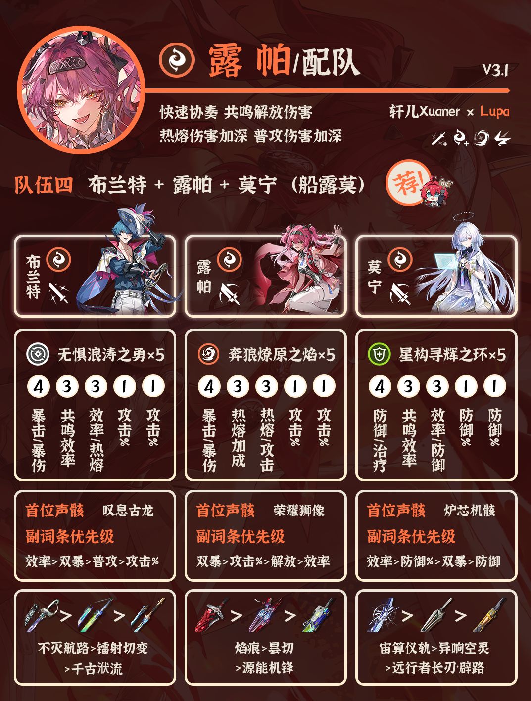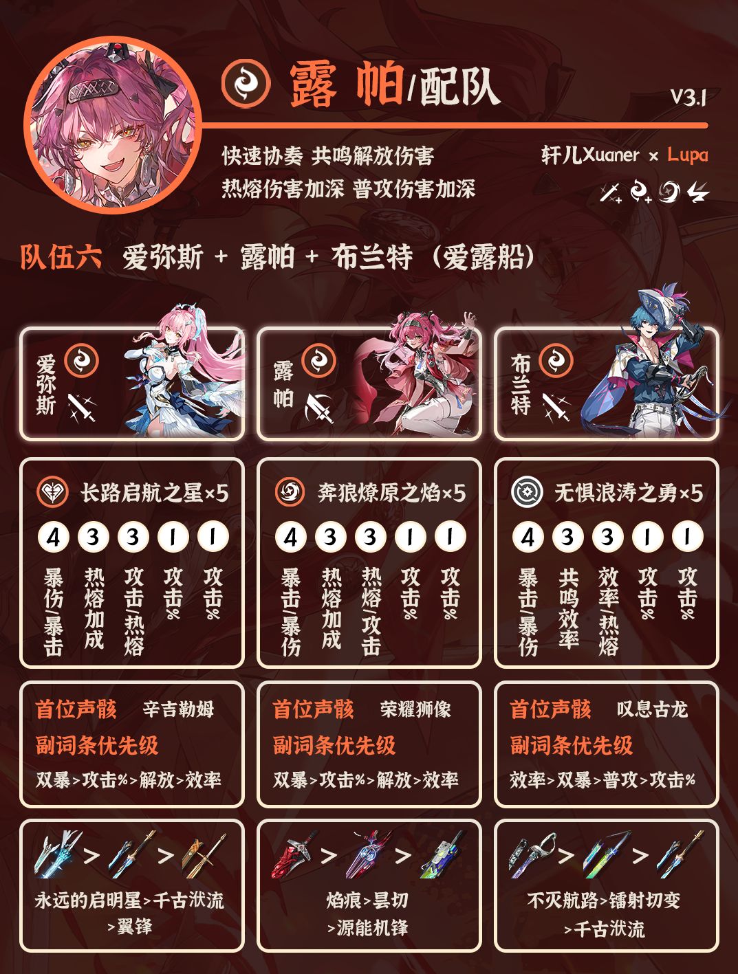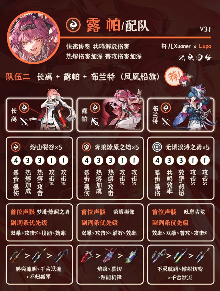 ② 长离+露帕+布兰特:老的三火队,比较吃操作,轮切队伍。